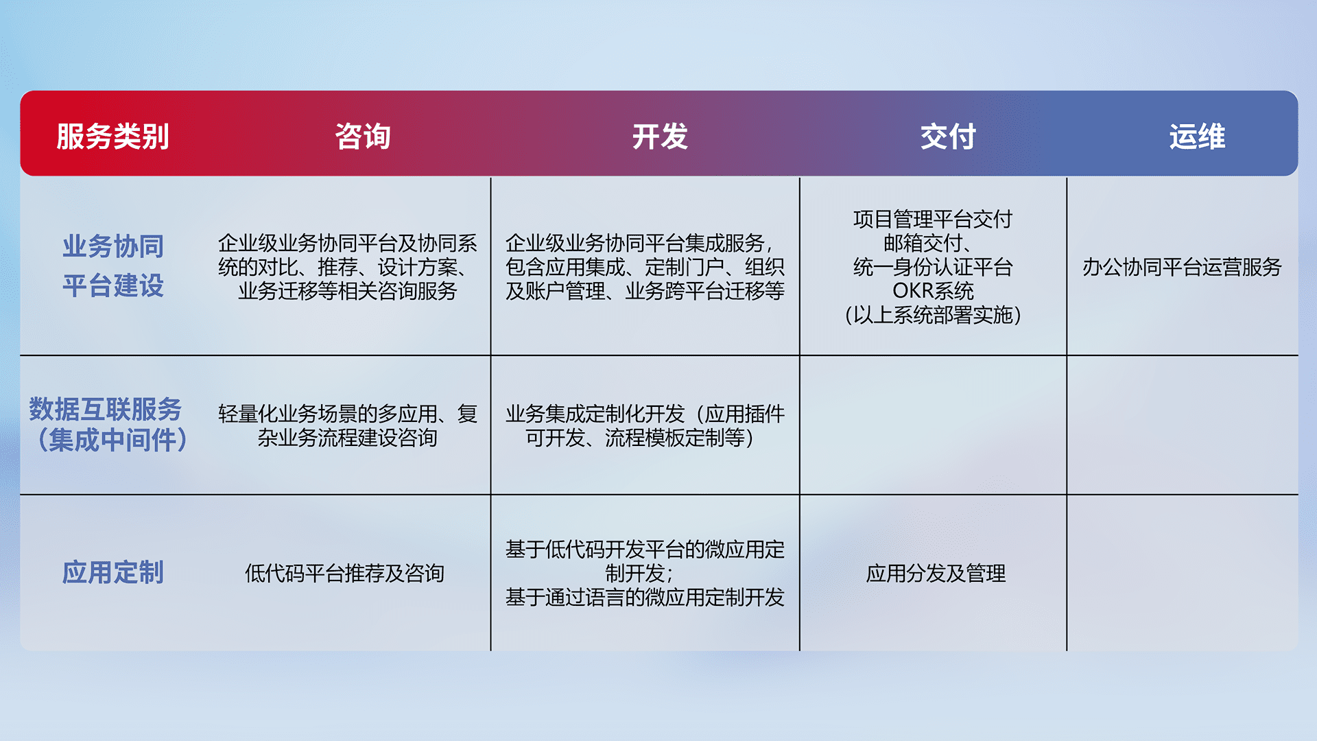 针对钉钉、、、企微、、IDaas等平台级产品提供产品的规划、、、方案、、、、交付、、、、定制化开发等服务,,实现如统一协同办公、、、、智能客户服务、、、混合会议管理、、智能数据查询、、、、等业务场景,,实现数字化转型。。。