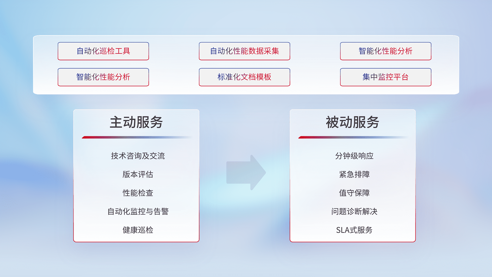 智能化工具和标准化文档,,保障服务质量,,提供主动服务(包含技术咨询、、、版本评估、、性能检查、、、自动化监控与告警、、健康巡检)和被动服务包含(分钟级响应、、、紧急排障、、、、值守保障、、问题诊断解决、、、SLA服务)。。。。