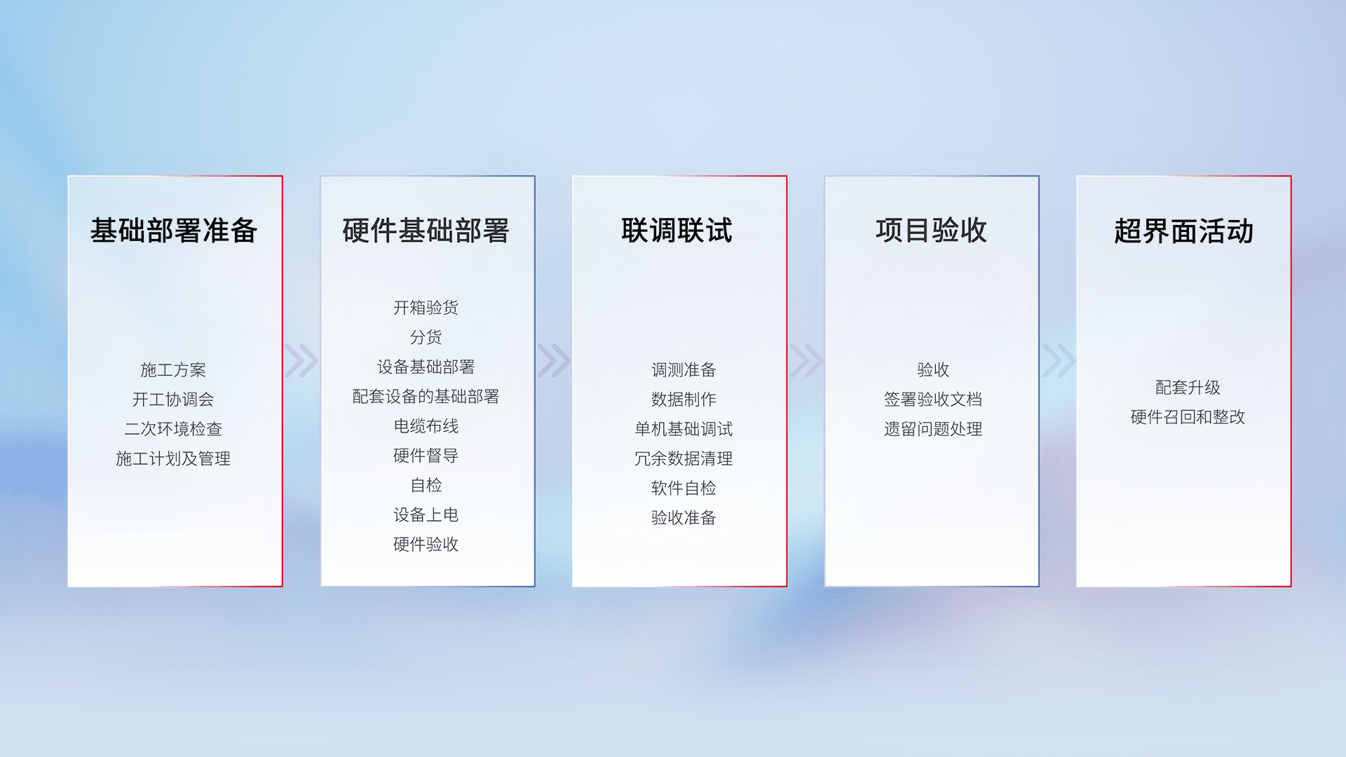 从基础部署准备、、硬件基础部署、、联调联试、、、、项目验收、、越界面活动的全过程可追溯,,,,保证施工质量和进度。。