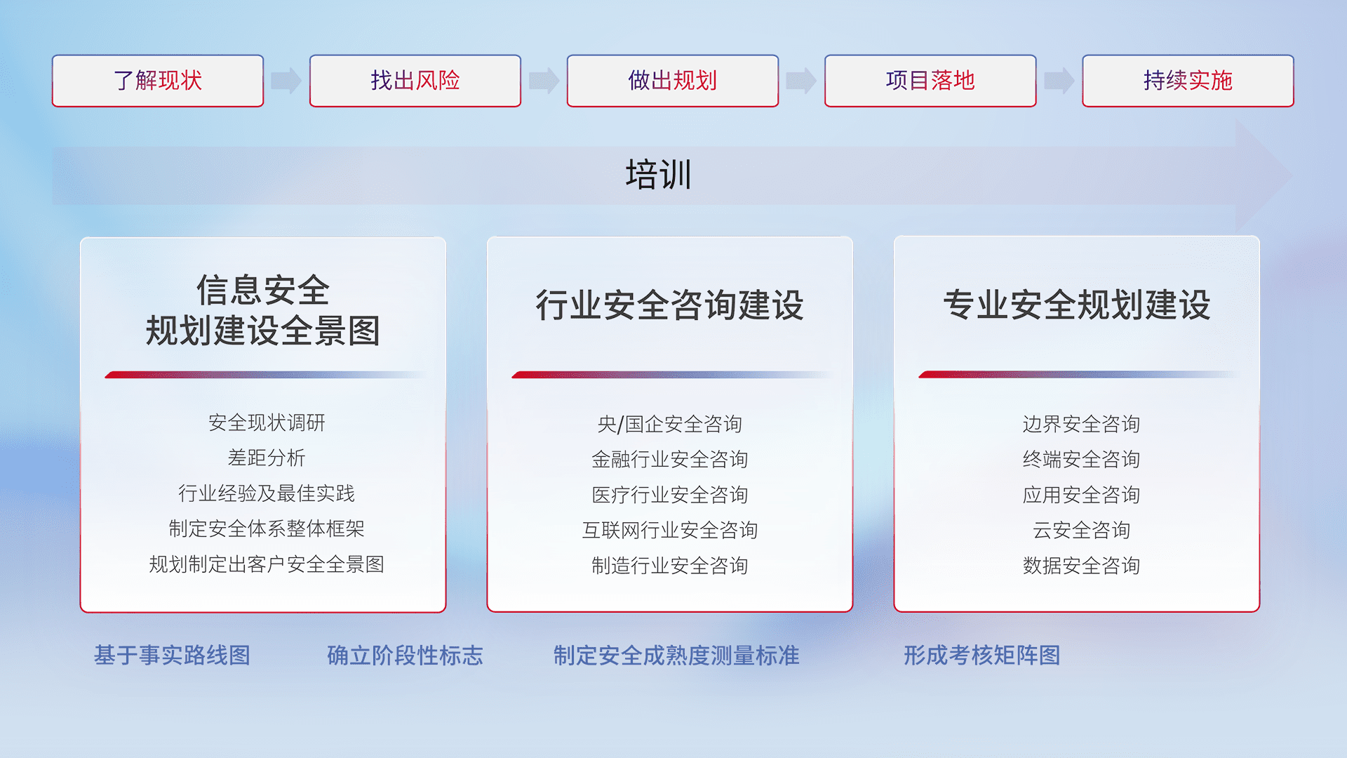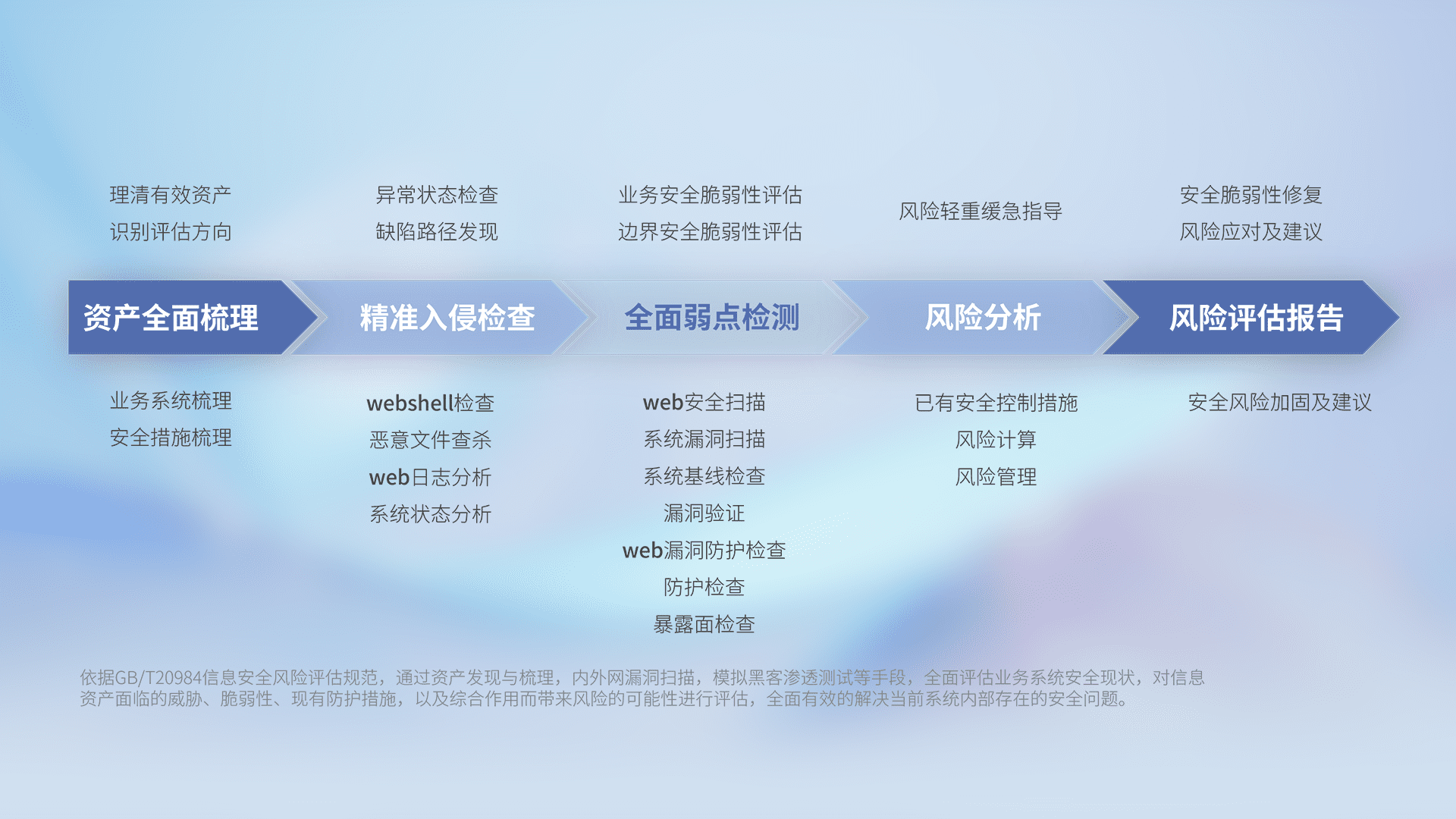 针对客户行业特性,,以专业的安全服务+多厂商联合解决方案提供专属的一站式安全管理服务,,帮助客户全面感知网络空间威胁,,,,基于识别、、、检测、、、分析、、、、防护、、、监测、、、响应的服务理论模型,,,,从方案咨询、、、集成交付、、评估验证、、、、优化加固、、运维运营,,,致力于为客户提供完整的闭环管理式安全服务。。以实战经验为客户打造高抵御风险的安全体系,,,帮助客户发现威胁、、、、对抗威胁、、、、处置威胁,,不断积累安全对抗能力,,,持续保障数字化安全。。。。